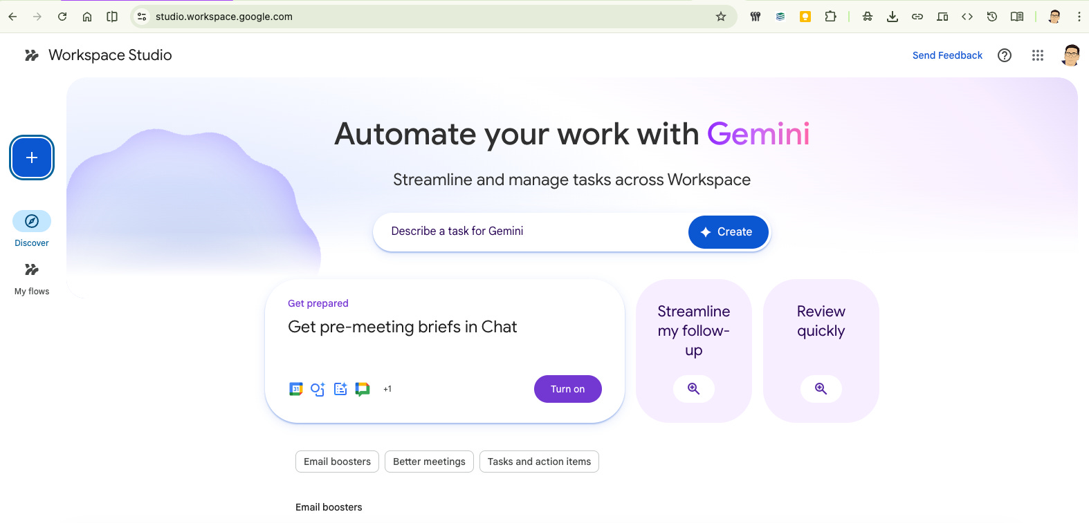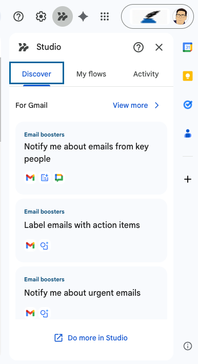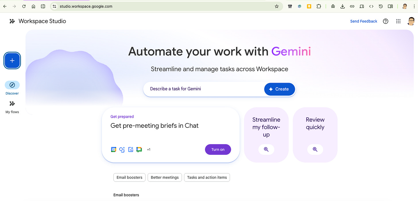 You can go to Workplace Studio directly, but I actually stumbled on it when I was in Gmail on day. The automated Gmail-Gemini actions had been replaced with Flows…with the encouragement to try them out.